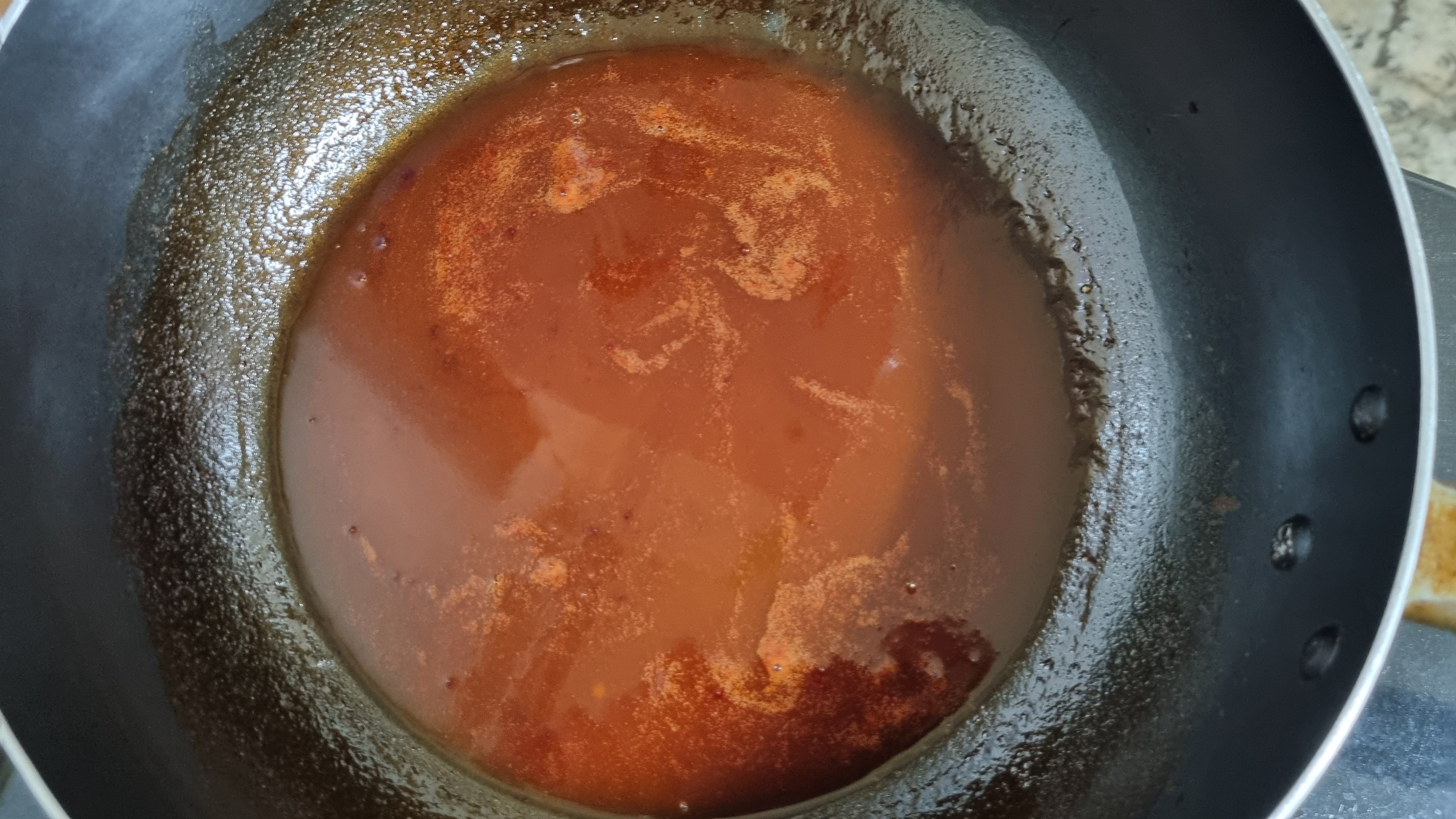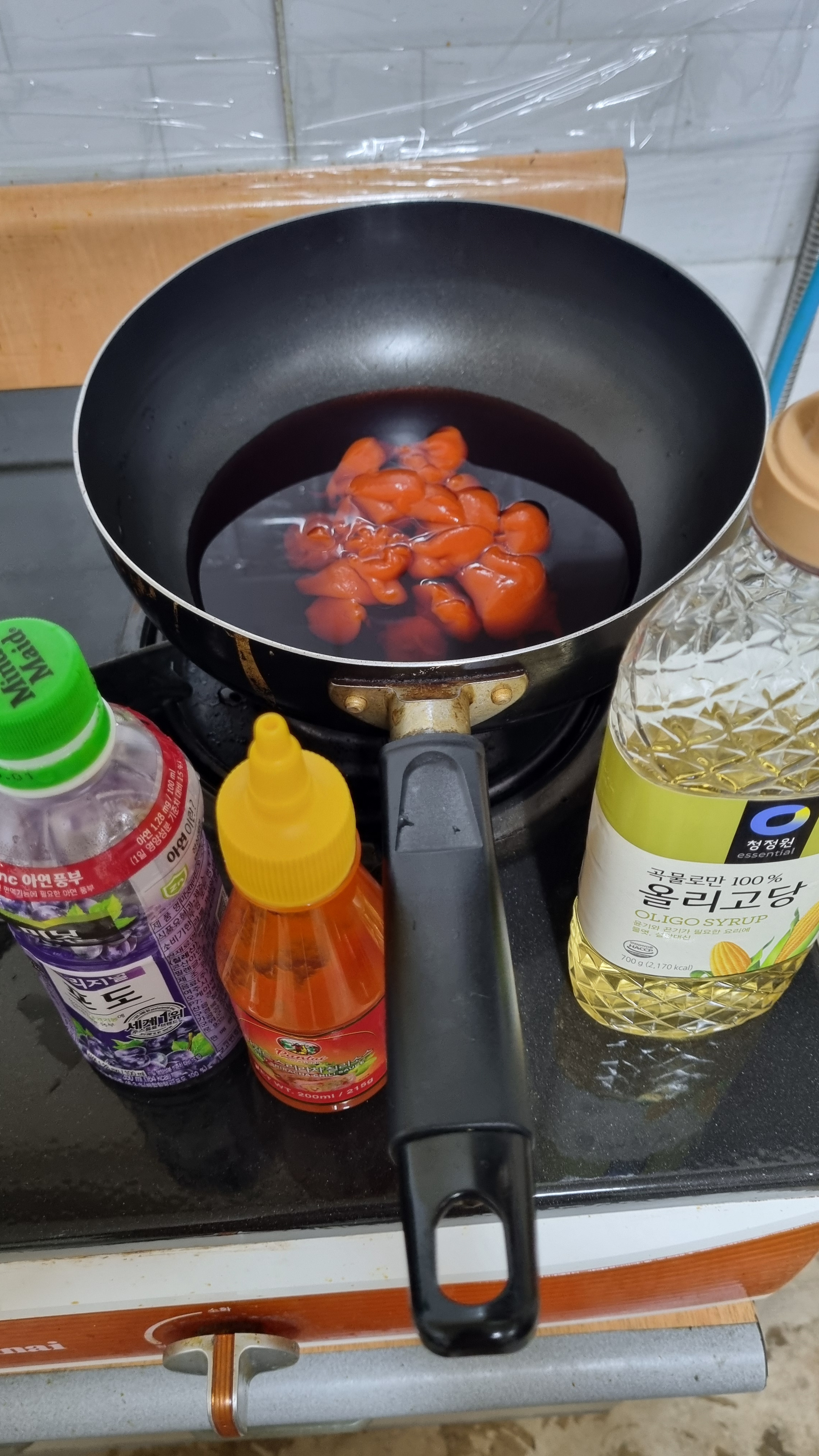 3. 포도주스에 올리고당과 칠리소스를 넣어 은근하게 졸여 주세요.