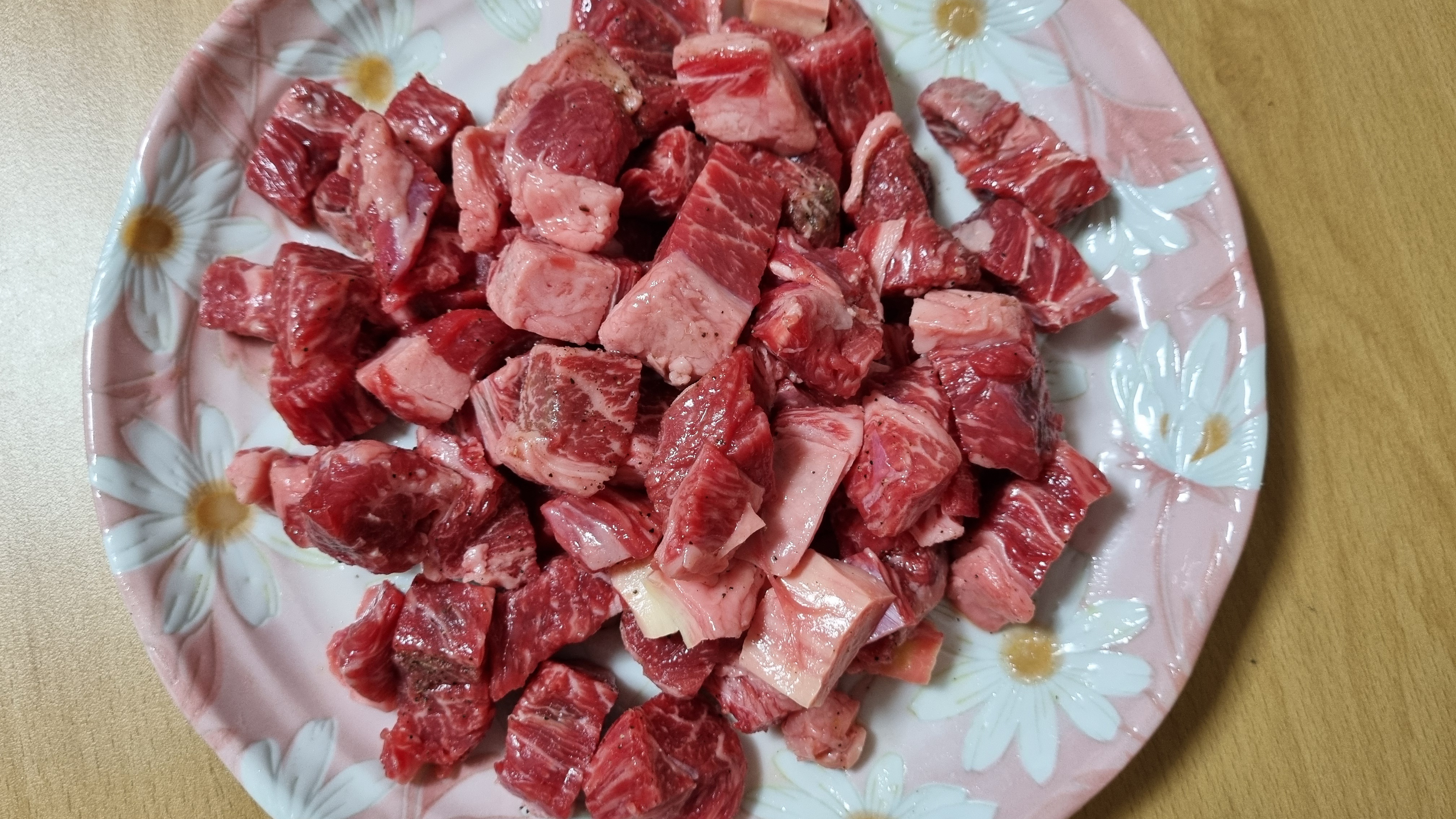 1. 소고기 등심을 깍뚝썰어 소금, 후추, 올리브오일로 재워서 숙성시키세요.