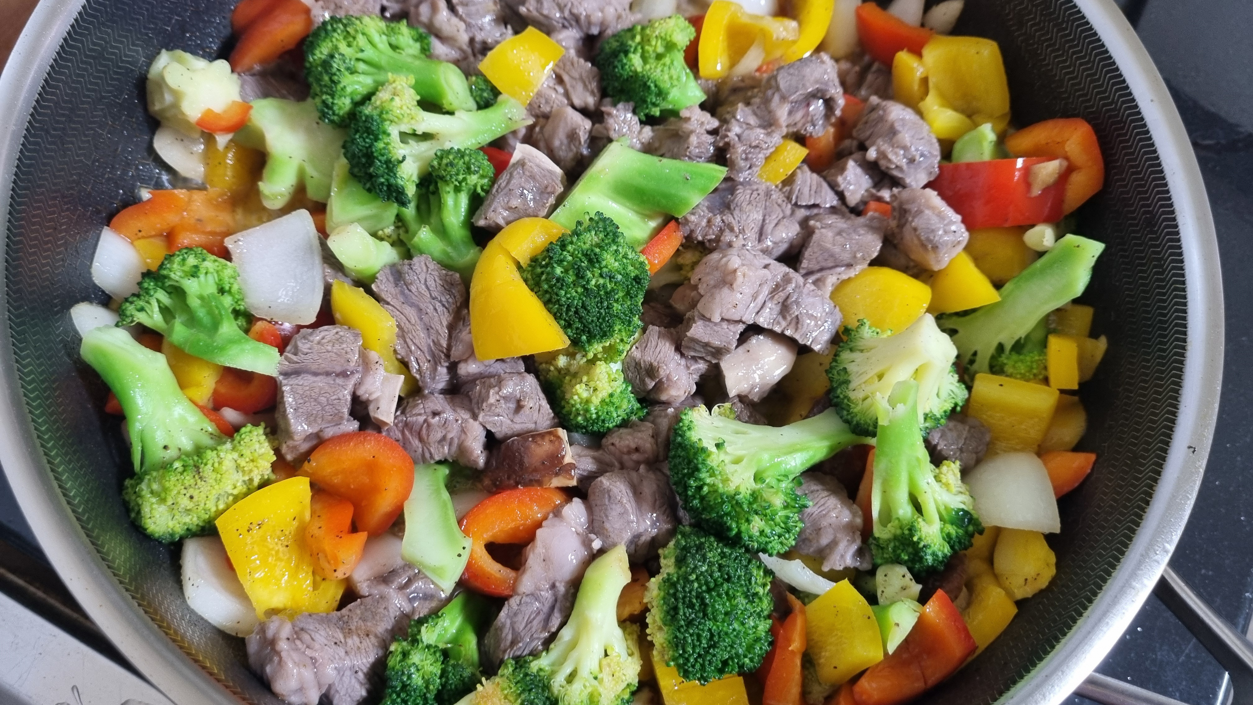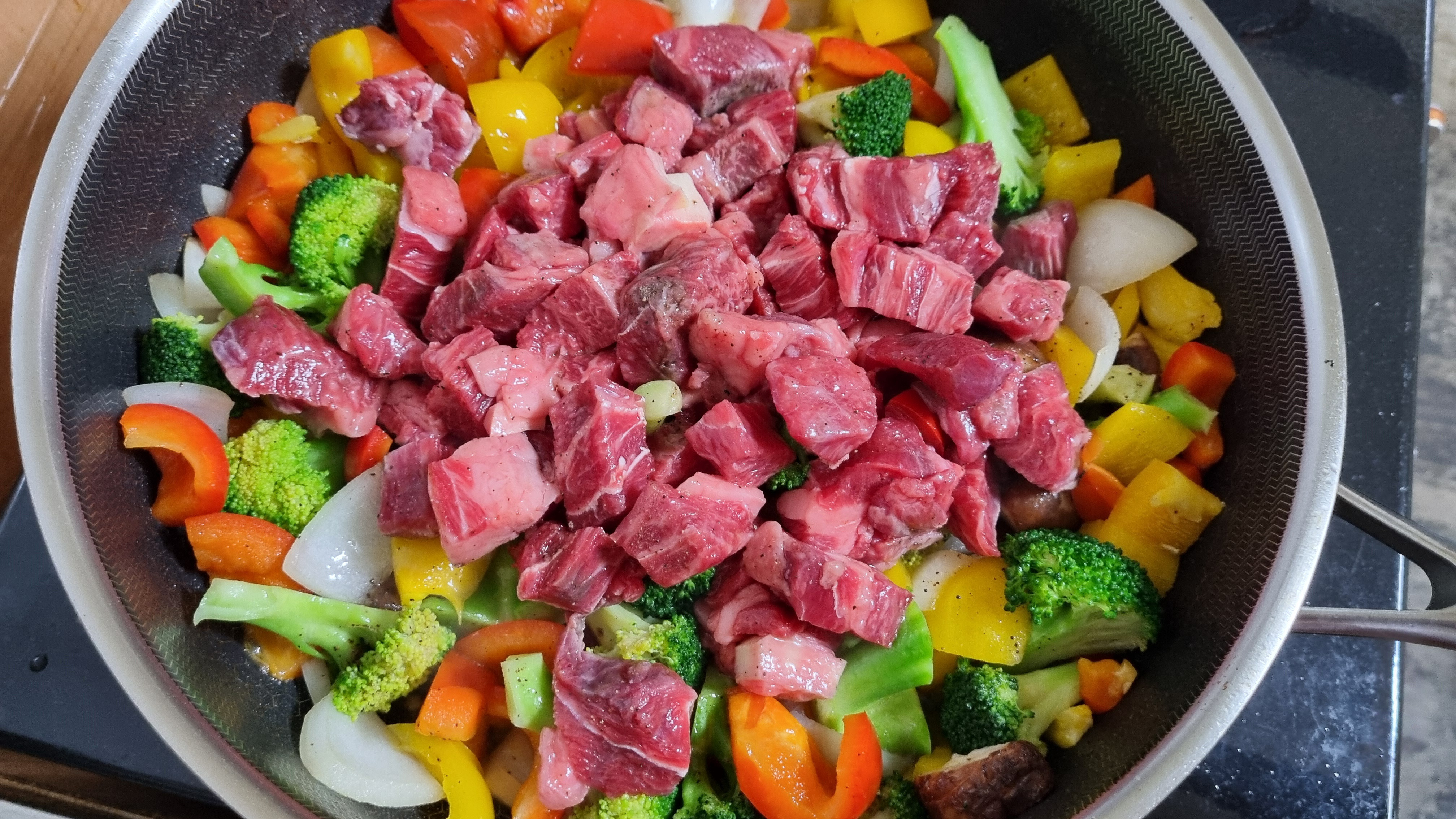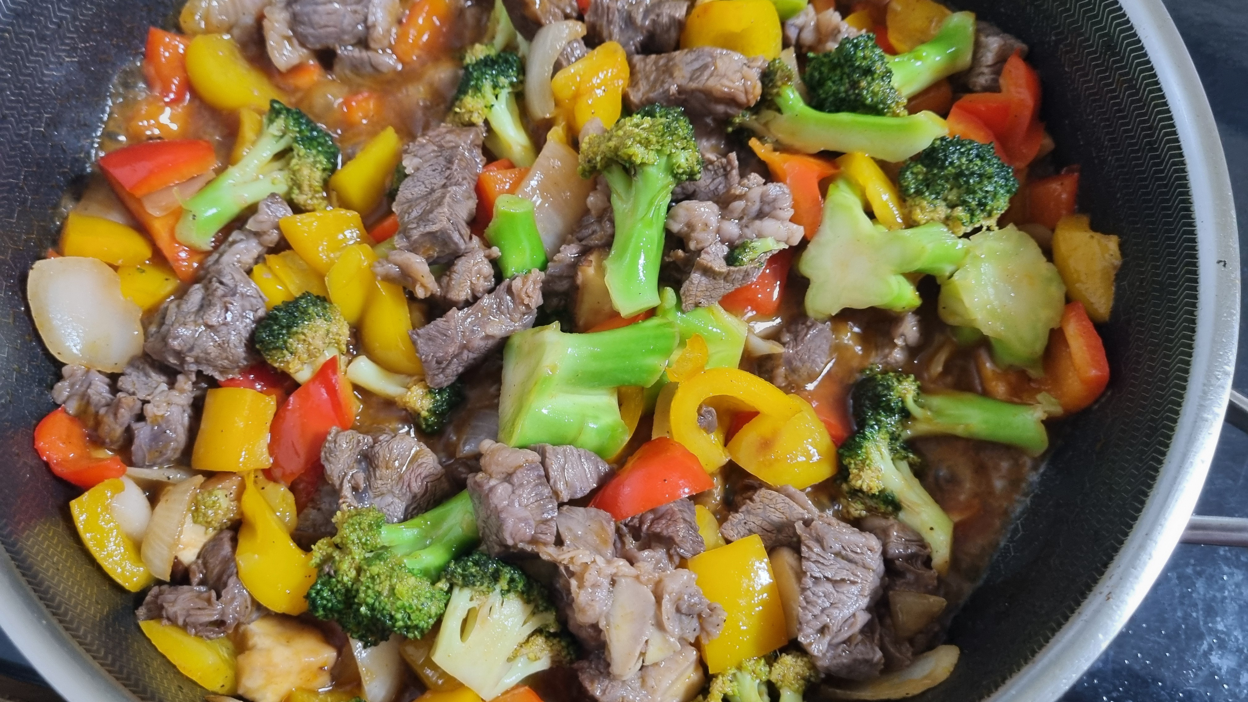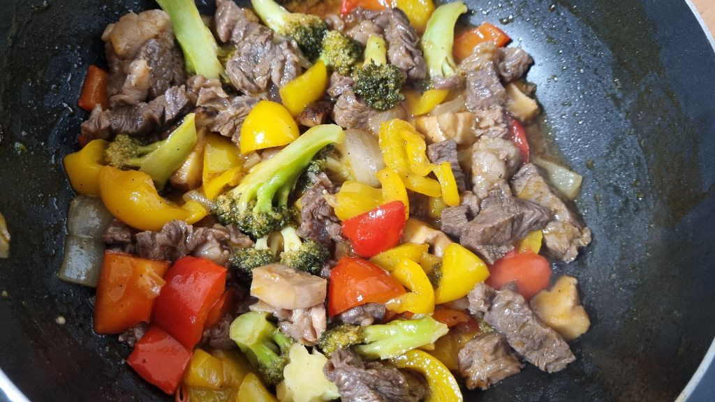 5. 볶은 채소에 소고리를 넣고 익히고, 소스를 넣어 졸이면 완성입니다.