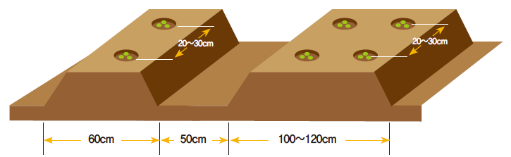 ● 2줄 재배의 경우 이랑너비 100~120cm에 고랑너비 50cm로 준비한다.