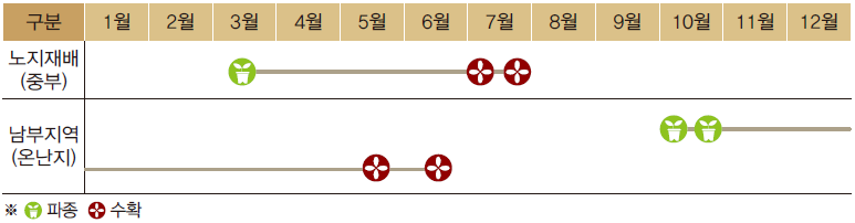 중부지방은 3월 하순경에 파종하여 6월에 수확한다.