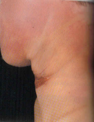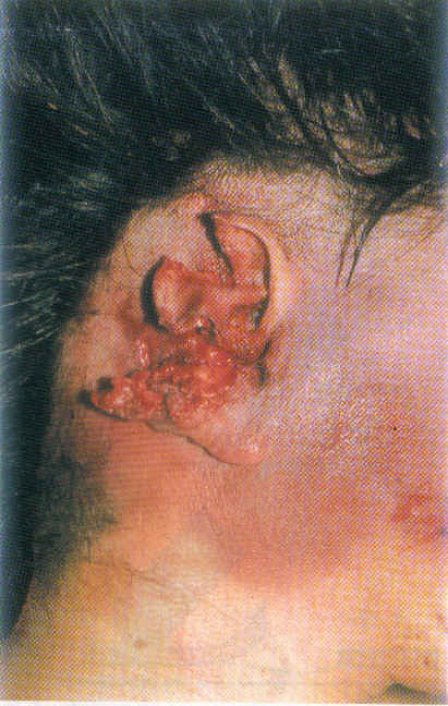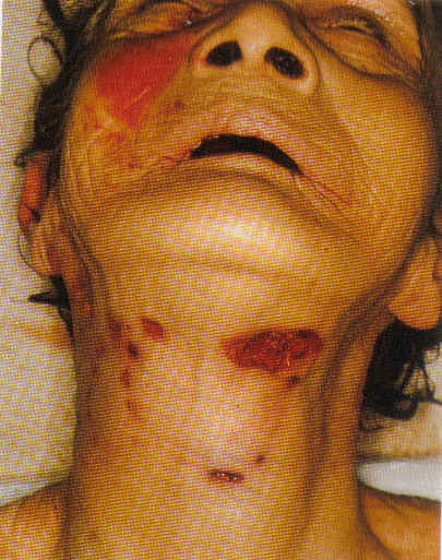 2. 교합손상: 교합손상(bite injury)이란 말 그대로 치아의 교합에 의하여 일어나는 손상이다. 교합손상은 하나하나의 치아 또는 위아래턱의 치열과 일치한다. 강간시 저항의 수단으로 사용되기 때문에 가해자의 혀나 입술에 형성되기도 한다. 교합손상은 인간에 의한 것과 동물에 의한 것을 구별해야 한다. ==> 밑에 있는 사진은 고양이에게 물려 형성된 교합손상이라고 하네요.