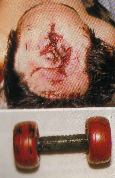마. 내부손상 - 인체에 강한 둔력이 가하여지면 외력이 작용한 부위는 물론 외력이 전달되어 작용부위에서 떨어져 있는 내부장기가 파열될 수도 있다. 대개 간, 췌장, 신장 등의 실질장기가 잘 파열된다. 위에 음식물이 가득 차 있거나 방광에 소변이 차 있으면 파열되기 쉽다. 자궁도 임신된 상태에서 파열되기 쉽다.