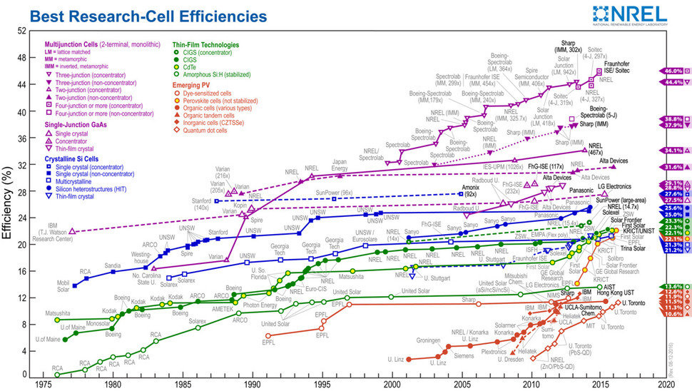 미국 재생에너지연구소(NREL)의 태양전지 효율 현황판.