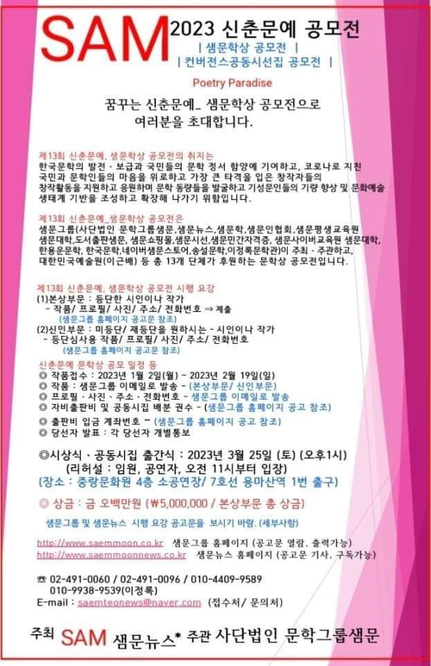 [샘문뉴스] ■2023 신춘문예 시행요강 공고문■ - 제13회 샘문학상 - http://m.saemmoonnews.co.kr/1070