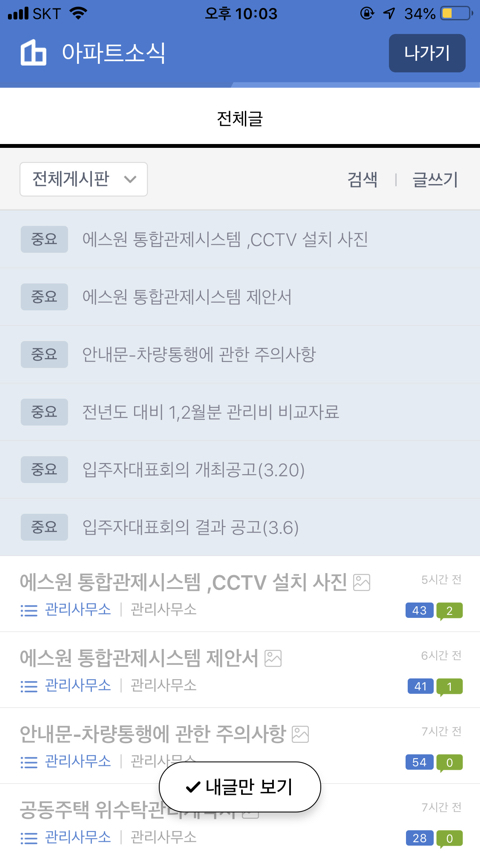 모빌 앱에서 다양한 아파트 소식을 보세요 작성자회장 유혜정 -(111/1803)|작성시간19.03.16|조회수353 목록 댓글 0 글자크기 작게가 글자크기 크게가 모빌 앱에서 다양한 아파트 소식을 보세요.카메라 설치 사진 및 사업설명회 당시 자료관리비 분석 자료 등 많은 자료가 있습니다. 다음검색 현재 게시글 추가 기능 열기 북마크 공유하기 신고 센터로 신고 댓글 댓글 0 댓글쓰기 답글쓰기 댓글 리스트