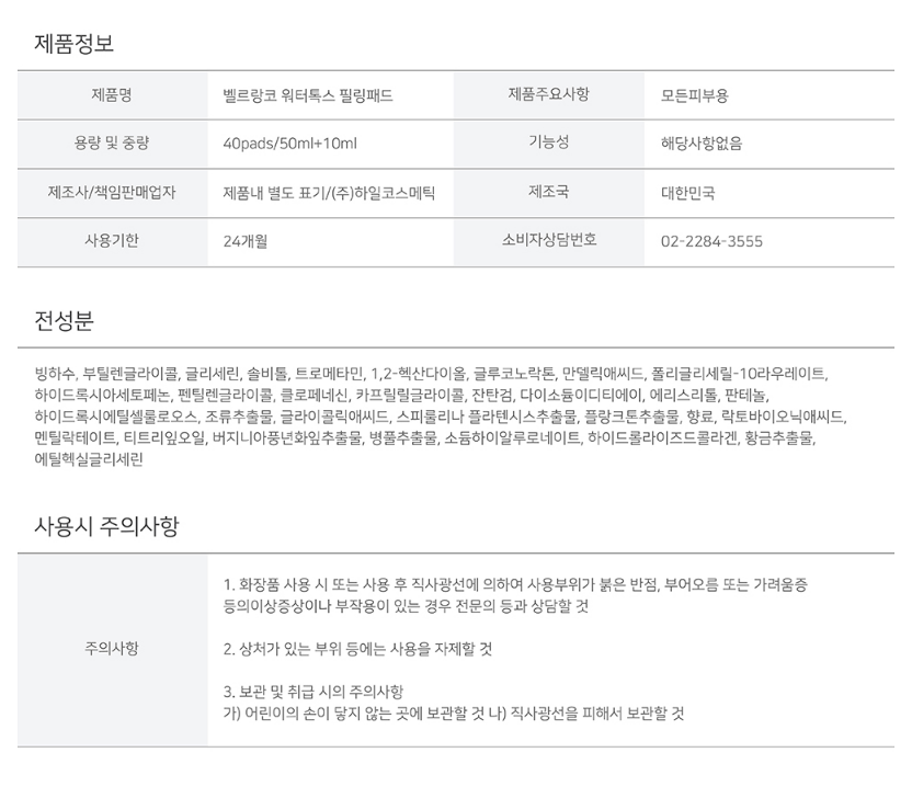 강추 베스트셀러~인기 많은 필링패드~환절기에 최고~저자극 물광 필링 패드 벨르랑코 물톡스 필링패드 40pads/60ml