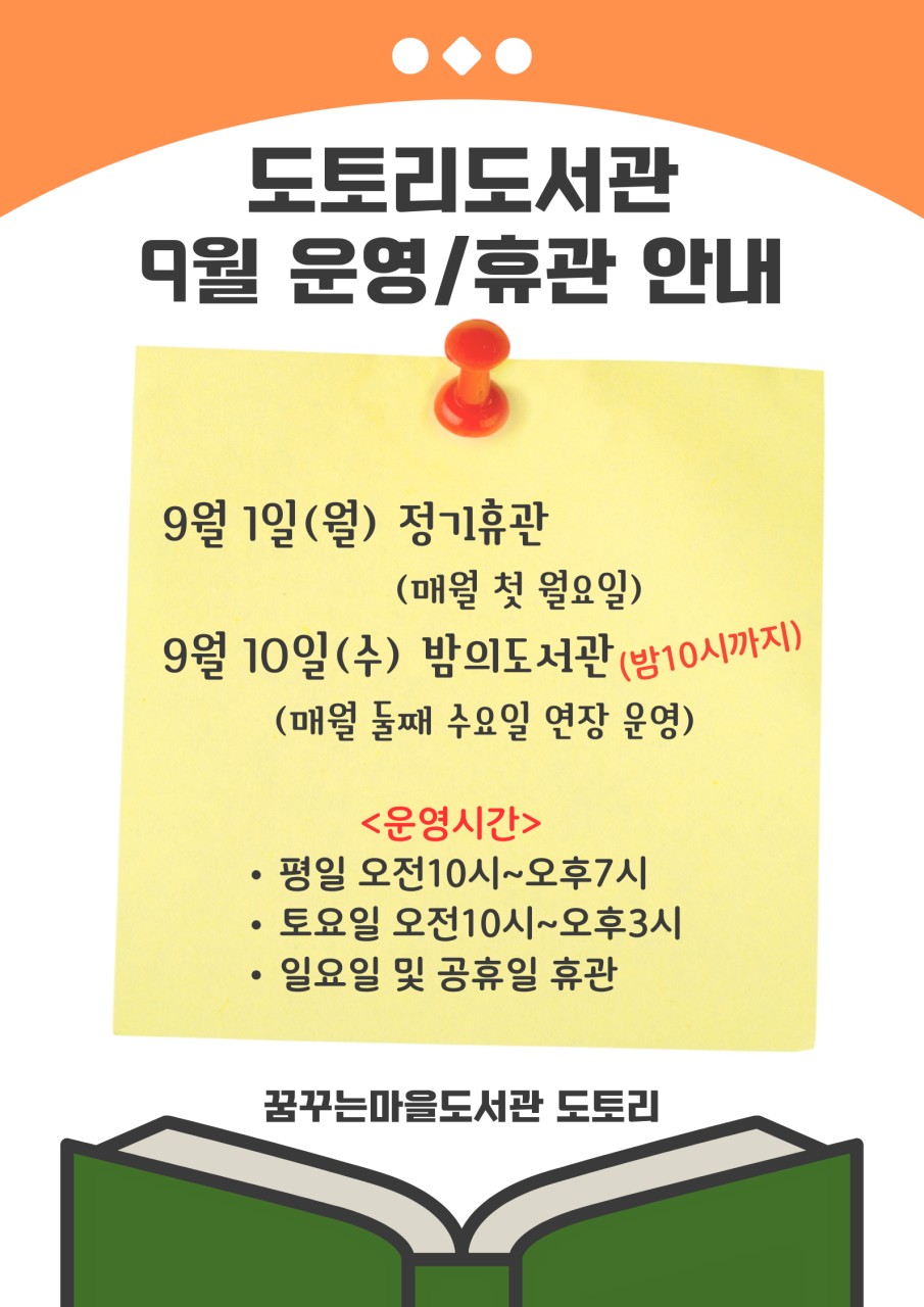 ★밤의 도서관 : 9월10일(수) 매월 두번째 수요일 밤10시까지 연장운영