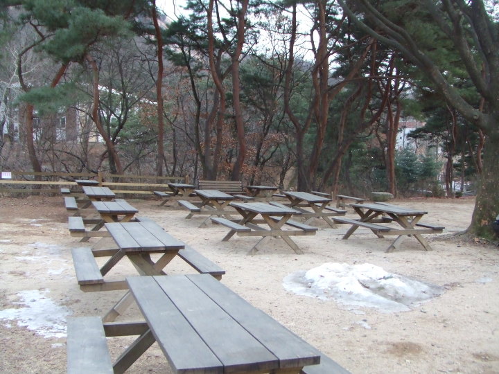 식당 외부 잔디밭에는 나무로 만든 간이용 탁자가 여러개 마련돼 있습니다.