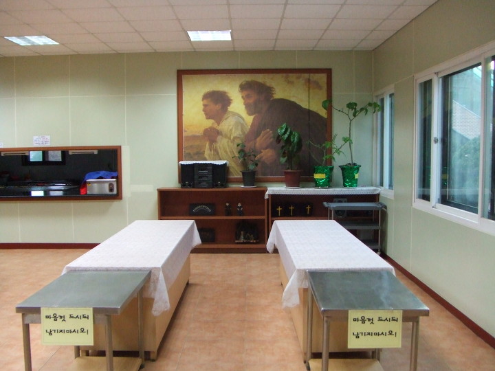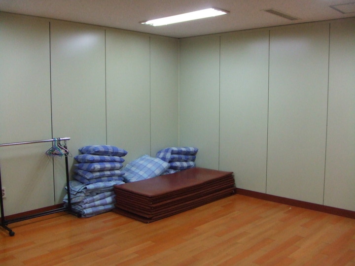 예배실 입구앞에 복도를 기준으로 좌측에 방2개, 남녀 화장실 각1개, 우측에는 방3개가 마련돼 있습니다.......(1개방당 수용인원은 12 ~ 15명)