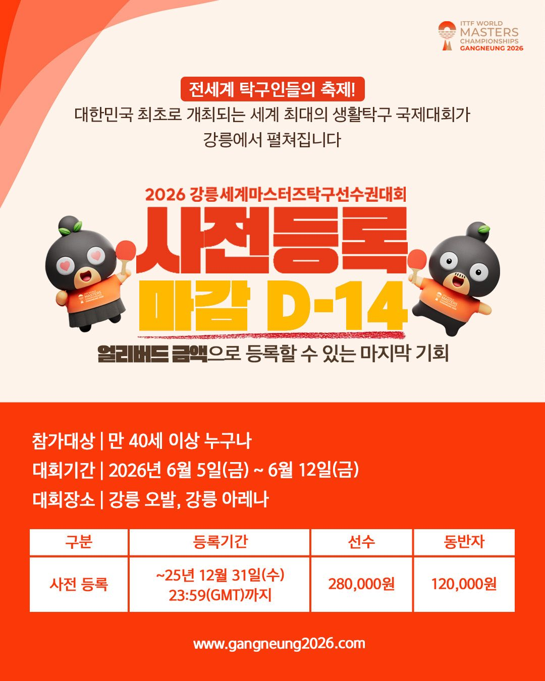 2026 강릉세계마스터즈탁구선수권대회 홍보합니다. 작성자GBTTA 전무이사|작성시간25.12.18|조회수251 목록 댓글 0 글자크기 작게가 글자크기 크게가 2026 강릉세계마스터즈탁구선수권대회 얼리버드 금액으로 등록할 수 있는 마지막 기회🏓✨지금 바로 홈페이지를 통해 등록하세요!✔️Homepage/홈페이지: www.gangneung2026.com 다음검색 현재 게시글 추가 기능 열기 북마크 공유하기 신고 센터로 신고 댓글 댓글 0 댓글쓰기 답글쓰기 댓글 리스트