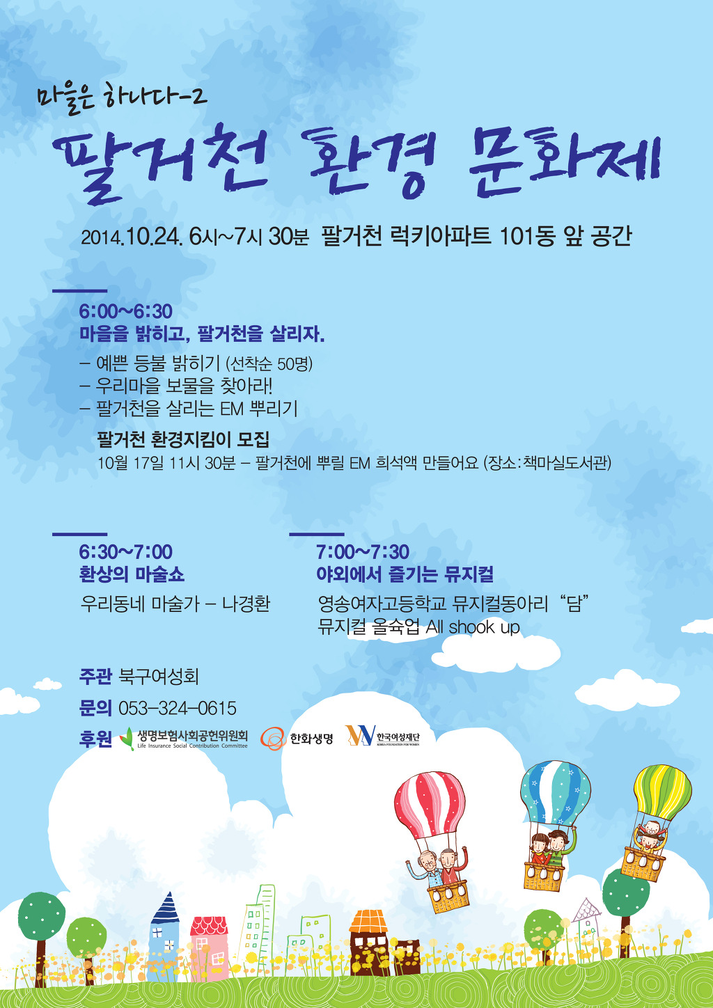 팔거천 환경문화제 작성자북구여성회|작성시간14.10.14|조회수55 목록 댓글 0 글자크기 작게가 글자크기 크게가 다음검색 현재 게시글 추가 기능 열기 북마크 공유하기 신고 센터로 신고 댓글 댓글 0 댓글쓰기 답글쓰기 댓글 리스트