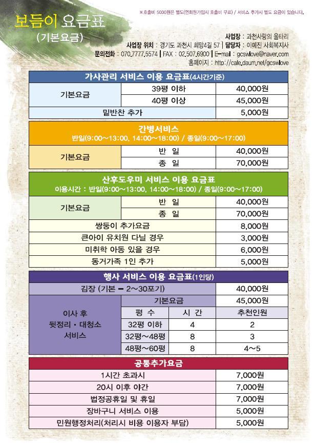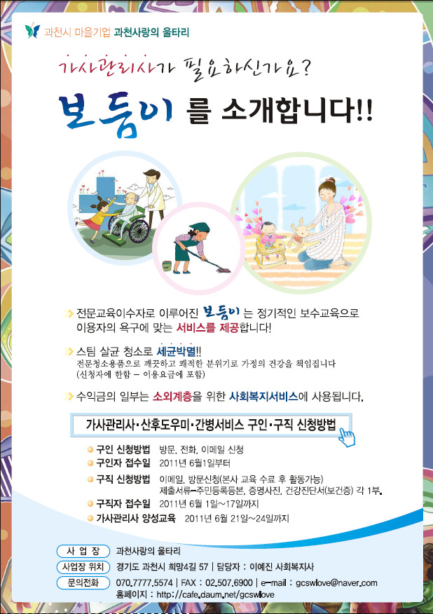 과천시 마을기업 과천사랑의 울타리 - 가사관리사, 산후도우미, 간병서비스 구인 구직 서비스 신청하세요 작성자과천교회복지재단|작성시간11.06.03|조회수138 목록 댓글 0 글자크기 작게가 글자크기 크게가 다음검색 현재 게시글 추가 기능 열기 북마크 공유하기 신고 센터로 신고 댓글 댓글 0 댓글쓰기 답글쓰기 댓글 리스트