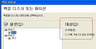 백업 마법사가 뜨면 다음을 누르고 백업할 드라이브(운영체재가 깔린 드라이브 , 대개 경우 C:) 원본 파일을 택하고 대상(D)는 꼭 파일을 택한다 .