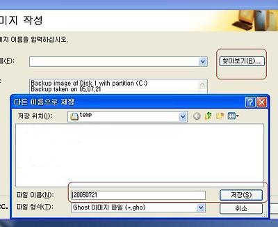 다음을 누른후 찾아보기를 눌러 고스트이미지를 저장하려는 폴더를 찾아간 후 (고스트 백업 전용 폴더를 고스트 백업한 날짜별로 만들길 권한다 .) 파일이름을 정해주고 저장을 누른다 . 나는 20050721이라고 파일 이름을 정해보겠다.