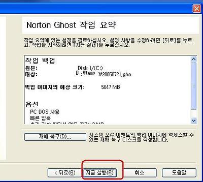 저장해서 파일이름에 경로와 파일 이름이 박히면 다음을 누른다 . (단 , 여기서 파티션이 다른 하드에 백업폴더를 만들고 저장해야 한다 . C드라이브의 이미지를 C에 저장할 수 없다 . 저장하려면 백업하려는 드라이브에 이미지 저장 불가라고 메시지가 뜬다 .) 고급 설정이나 외부장치 경고가 뜨면 무시하고 다음과 계속을 누른다 . 재해복구라고 떠도 계속을 누르면 된다 . 아래 그림에서 지금실행을 누르면 고스트가 실행을 위해 시스템 종료중이라는 메시지를 남기며 도스로 재부팅 된다 . 도스에서 백업 작업을 마치면 다시 재부팅되어 윈도우즈로 돌아온다 .