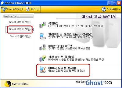이지 백업은 끝났다. 이제 이 백업 파일이 괜찮은지 검사해 봐야 한다. 고스트 메인에서 고급옵션 택한후 이미지 무결성 검사를 택한다 .