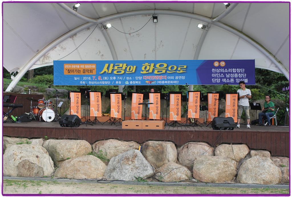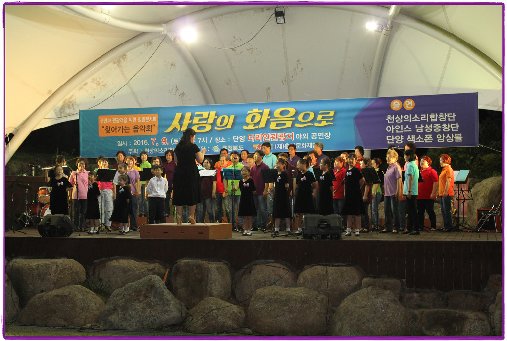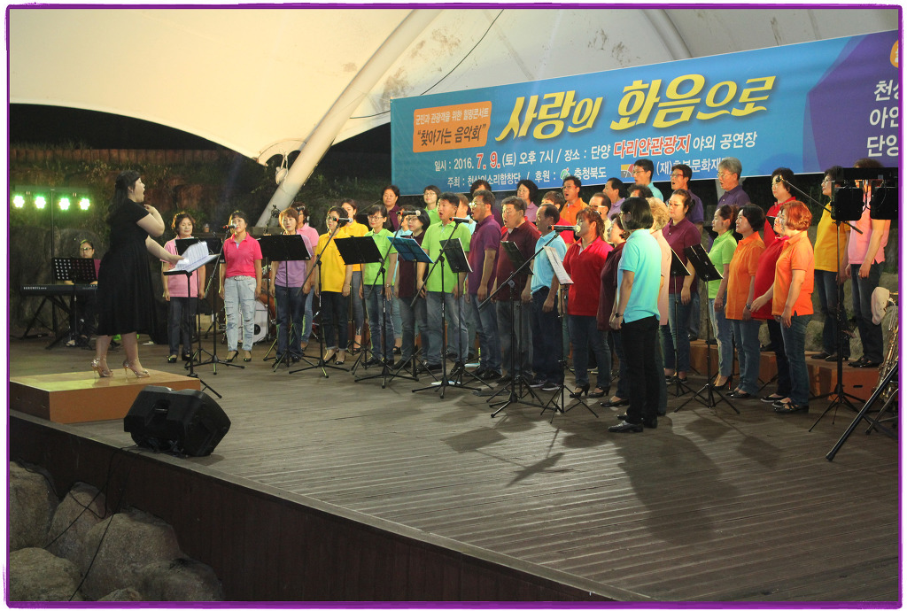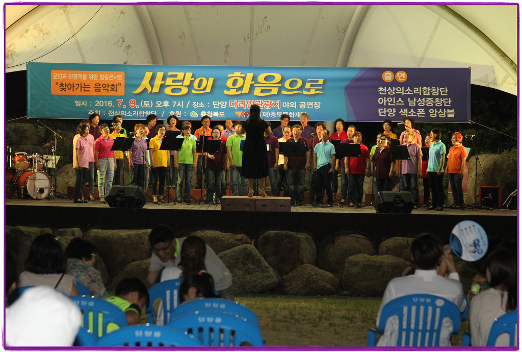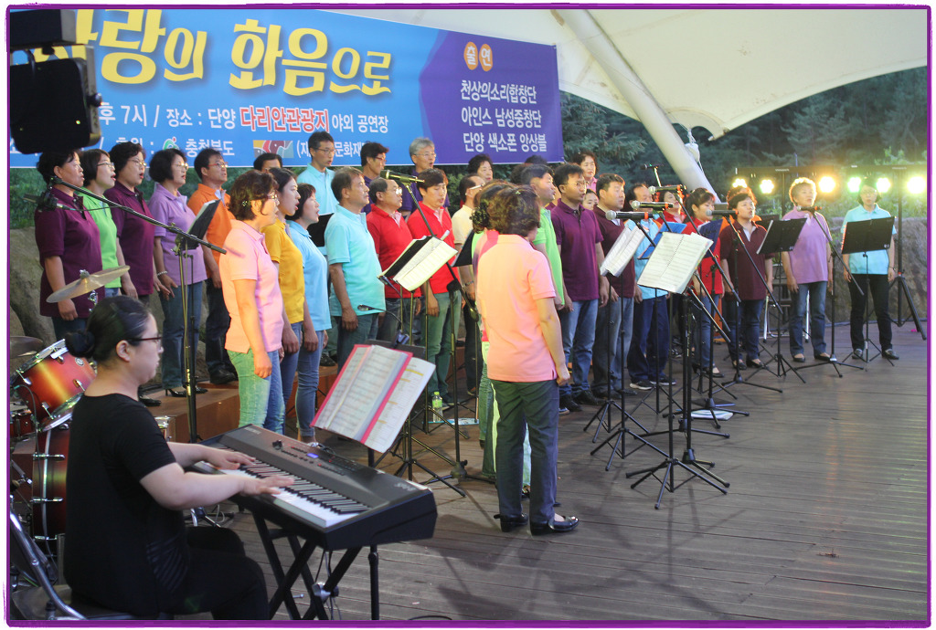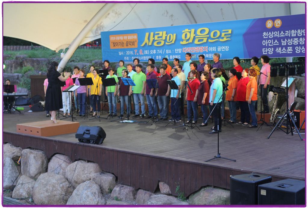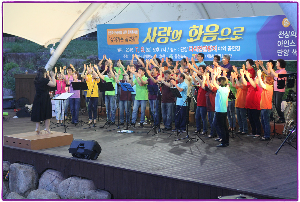 지난 7월9일(토) 단양 다리안관광지 야외공연장에서 '찾아가는 콘서트 - '사랑의 화음으로' 음악회를 열었다.