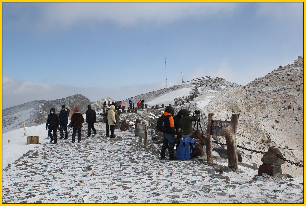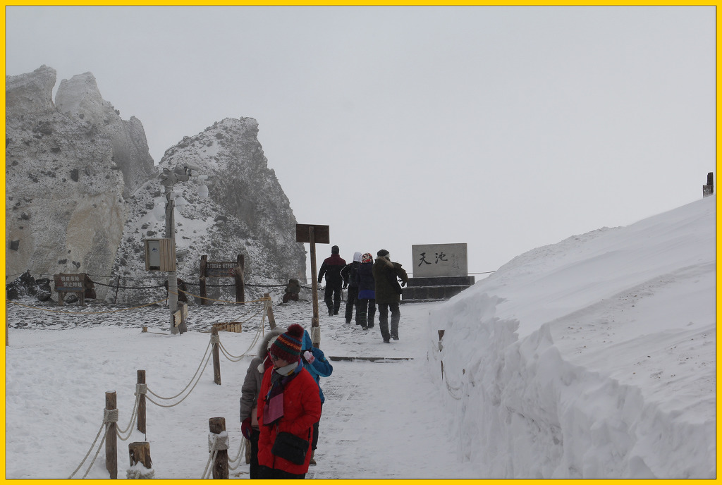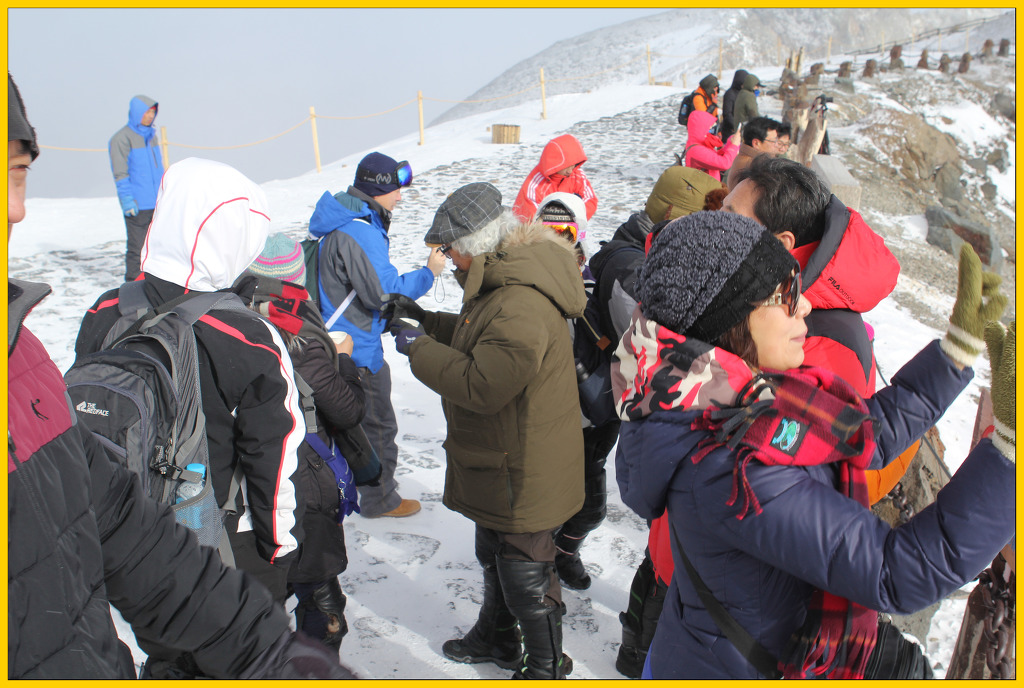 눈보라가 치는 가운데 드디어 백두산 정상에 올랐다.