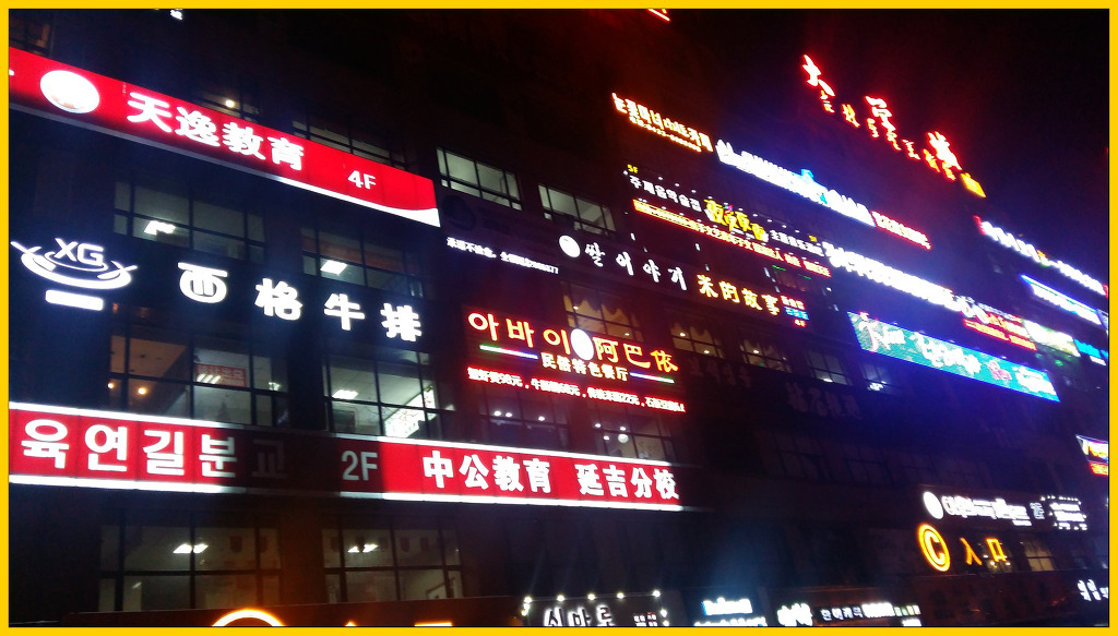 첫날 밤거리는 한국어 우선 중국어 다음으로 일관되게 달린 간판에서 진한 감동을 받았다.