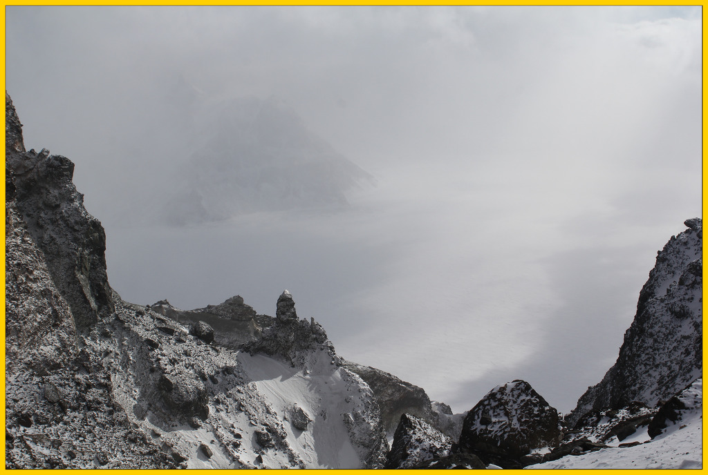 천지는 눈보라 속에 희미하게 모습을 들어냈다.