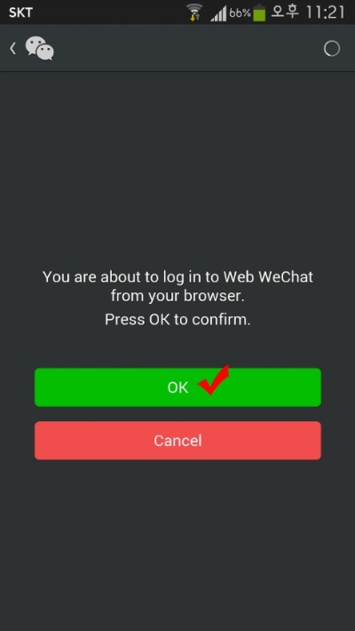 6. 그와 동시에 스마트폰에는 위쳇 웹버전 로그인 확인 문구와 함께 확인 버튼이 나옵니다. 'OK'를 선택해 주시면 연동이 시작됩니다.