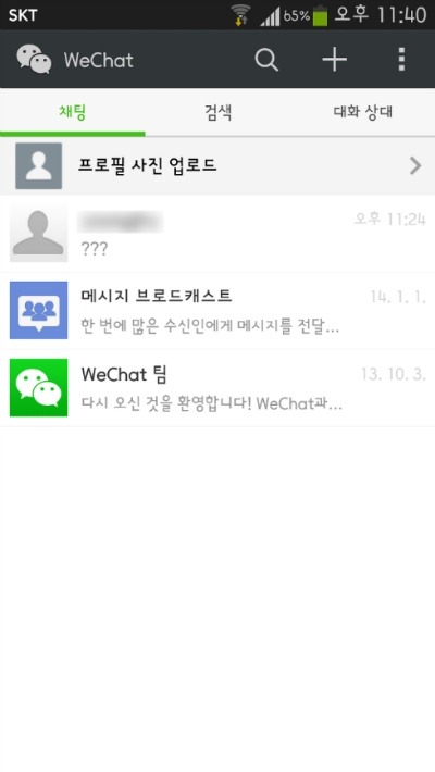 7. 스마트폰의 ok버튼 클릭과 함께 위쳇(WeChat) PC버전이 실행됩니다. 일단 좌측으로는 대화목록 탭이 보입니다.
