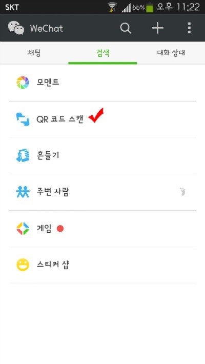 3. 스마트폰 위쳇(WeChat) 어플을 실행하시고 상단 검색 메뉴의 QR코드 메뉴를 선택합니다.
