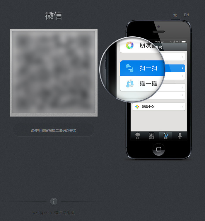 2. QR코드에 마우스를 올리시면 핸드폰 위쳇(WeChat) 어플을 통해 스캔을 하라는 설명이 나옵니다. 영문으로 이용하실 분들은 상단에보시면 'EN' 으로 선택하신후 영문으로 사용하시면 됩니다.