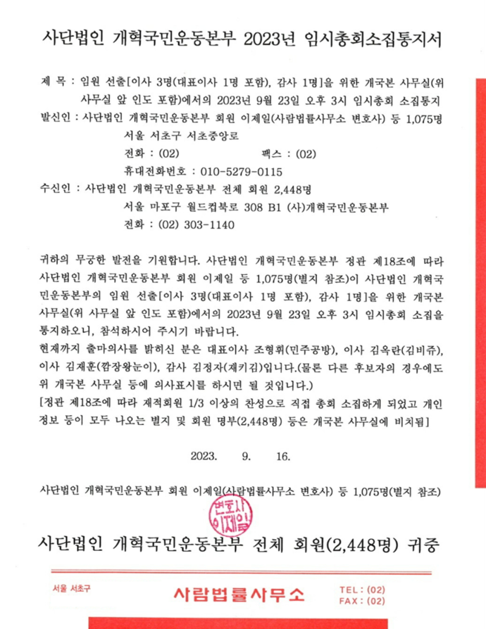 [반복 공지] 사단법인 개혁국민운동본부 2023년 임시총회소집통지 작성자권영준|작성시간23.09.16|조회수794 목록 댓글 1 글자크기 작게가 글자크기 크게가 다음검색 현재 게시글 추가 기능 열기 북마크 공유하기 신고 센터로 신고 댓글 댓글 1 댓글쓰기 답글쓰기 댓글 리스트 작성자방탄어르신 | 작성시간 24.08.22 작년에 척추가 골절되어 일을못한게 1년이 넘어가니 자동납부를 해지 해주세요 댓글 전체보기