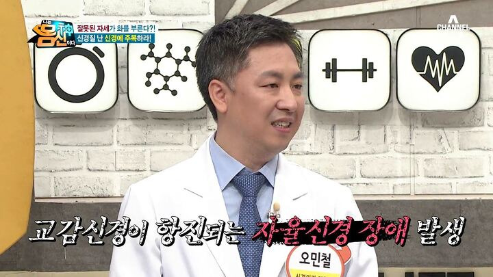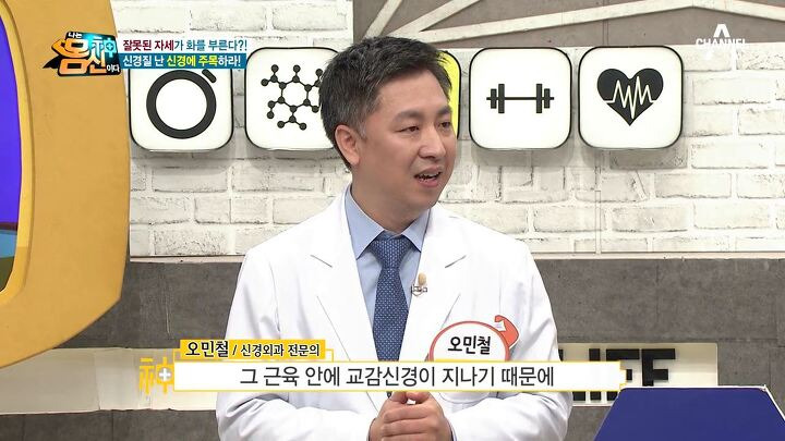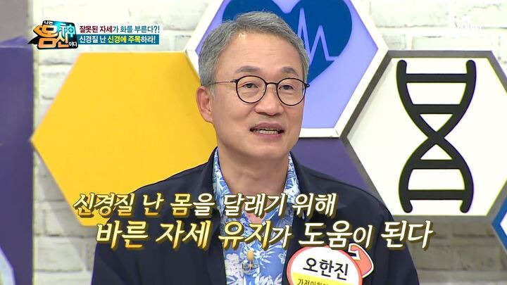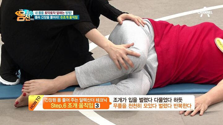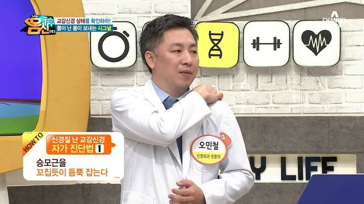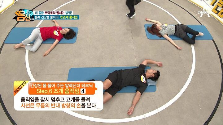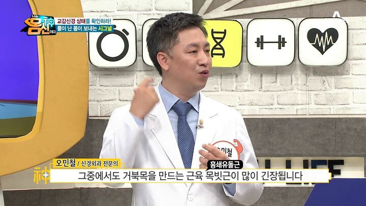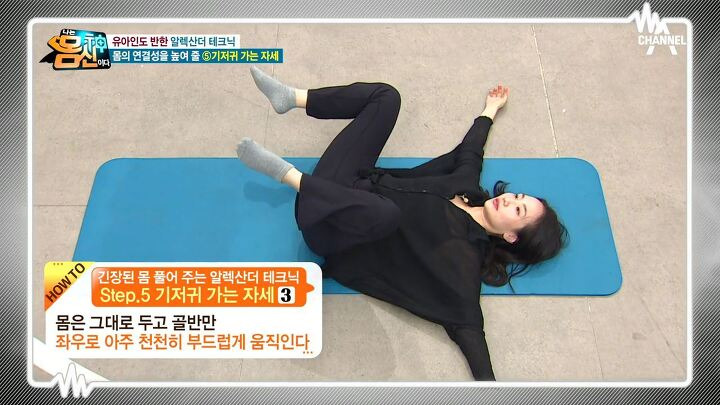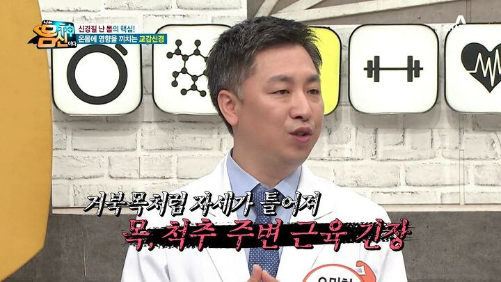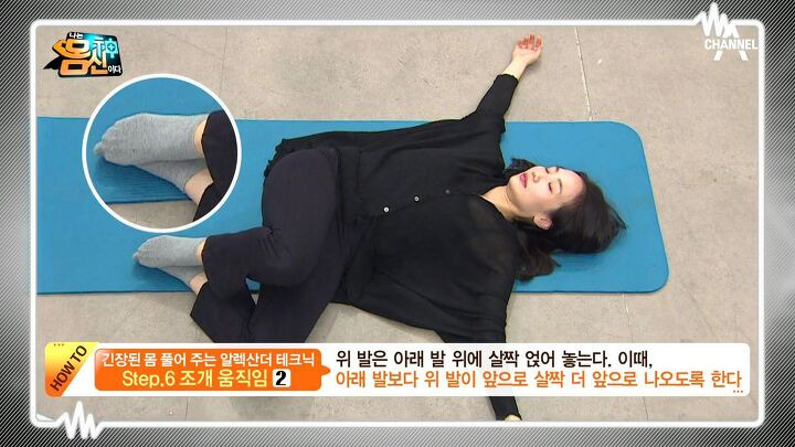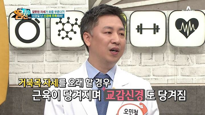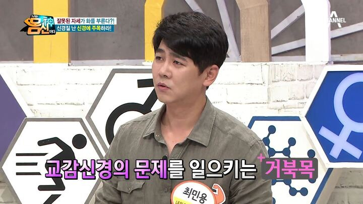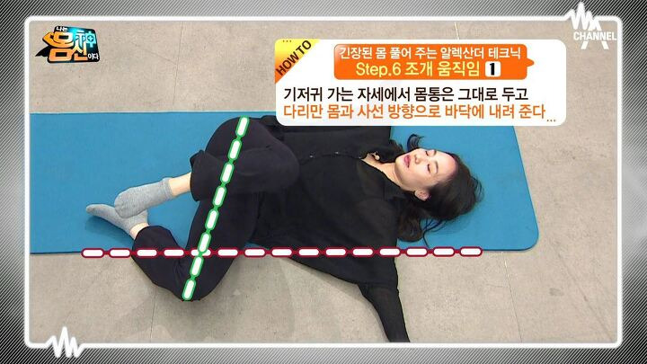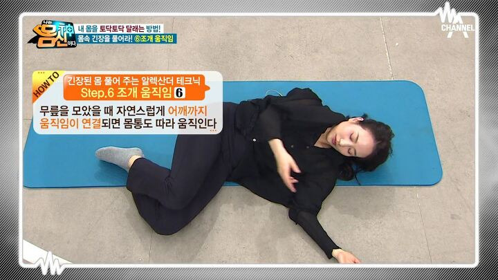 '거북목'이 내 몸에 끼치는 영향..? ※놀람 주의※ 몸이 신경질을 낸다? 내가 거북목이라면?! => 오늘 주목하셔야 합니다 :D Q. 거북목이란? A. 거북목은 어깨에 비해 귀가 5cm 이상 돌출된 상태로 경추가 역C자로 변형된 형태를 말합니다 목 근육 안에 교감신경이 지나기 때문에 거북목 자세를 오래 할 경우 근육이 당겨지면서 교감신경도 당겨진다고 합니다 이렇게 되면, 교감신경이 항진되는 자율신경 장애가 발생할 수 있다고 해요 이뿐 아니라, 자세가 교감신경에 나쁜 영향을 줄 수 있다고 하는데요 잘못된 자세 때문에 우리 몸 전체적으로 연결된 자율신경이 비틀어지고 당겨지면서 교감신경의 문제를 유발할 수 있다고 합니다 ㅜ^ㅜ 따. 라. 서 '신경질 난' 내 몸을 달래기 위해 바른 자세 유지가 도움이 된다고 해요 Q. 신경질 난 교감신경을 인지할 수 있는 방법은? A. 위 그림 증상 중, 3~4개 이상의 증상이 일주일 이상 지속될 경우 신경질 난 교감신경을 의심하고 개선할 필요가 있습니다. 이번에는 만져보면서 직접 진단해볼까요? 교감신경이 신경질 나면 거북목을 만드는 근육 목빗근이 많이 긴장됩니다 *신경질 난 교감신경* STEP 1. 승모근을 꼬집듯이 듬뿍 잡습니다 STEP 2. 승모근을 잡은 정도의 같은 힘으로 목빗근(흉쇄유돌근)을 잡습니다 목빗근을 잡았을 때 심한 통증과 저림이 느껴진다면 교감신경이 신경질 난 경우라고 해요 내 몸의 신경질을 다스리는 방법 신경질 난 교감신경을 다스리는 방법이 있다? 불필요한 움직임을 줄여 화가 난 몸을 달래 주는 알렉산더 테크닉! 알렉산더 테크닉은 오랜 긴장과 잘못된 습관으로 신경질 난 우리 몸을 편안하게 이완되도록 만들어 좀 더 자유롭게 움직일 수 있도록 해준다고 해요 그뿐만 아니라 스트레스나 잘못된 습관으로 발생하는 통증들을 개선하고 불면증, 불안증 해결에도 도움이 된다고 합니다 :D 내 몸을 편안하게 해 주는 움직임! 먼저 내 몸의 긴장도를 테스트해볼까요? 발꿈치는 바닥에 대놓고 발목만 까딱까딱 앞뒤로 움직여 봅니다 우리 몸은 근막으로 전신이 연결되어 있어 발목만 움직여도 머리까지 전신이 움직인다고 해요 이때, 몸에 경직된 부위가 있다면 발목의 움직임이 경직된 곳에서 막혀 전신 움직임은 볼 수 없다고 합니다! 이런 방법으로 진단해보면 내 몸이 잘 연결되어 있는지, 어디가 긴장하고 있는지 직접 체크해 볼 수 있어요! :D ### 긴장도 테스트! 내 몸을 편안히 만드는 방법 ### ## 영상으로 보기 ## ▼ 출처 몸신 가족들의 긴장도 테스트! 내 몸을 편안히 만드는 방법은?! 이번에는 ◎기저귀 가는 자세◎로 몸의 연결성을 높이는 방법을 알아볼게요 :) ◎기저귀 가는 자세◎ STEP 1. 편안히 누운 자세에서 다리를 가볍게 들어 올립니다 STEP 2. 발목 간격보다 무릎의 간격을 더 벌려줍니다 STEP 3. 몸은 그대로 두고 골반만 좌우로 아주 천천히 부드럽게 움직입니다 ◎조개 움직임◎ STEP 1. 기저귀 가는 자세에서 몸통은 그대로 두고 다리만 몸과 사선 방향으로 바닥에 내려 줍니다 STEP 2. 위 발은 아래 발 위에 살짝 얹어 놓습니다. 이때, 아래 발보다 위 발이 앞으로 살짝 더 나오도록 합니다 STEP 3. 조개가 입을 벌렸다 다물었다 하듯 무릎을 천천히 모았다 벌렸다 반복합니다 무릎을 억지로 모으지 않고 할 수 있는 만큼만 자연스럽게 해주면 됩니다 :D STEP 4. 움직임을 잠시 멈추고 고개를 돌려 시선은 무릎의 반대 방향의 손을 봅니다 STEP 5. 다시 무릎을 모았다 벌렸다 하는 움직임을 반복합니다 STEP 6. 무릎을 모았을 때 자연스럽게 어깨까지 움직임이 연결되면 몸통도 따라 움직입니다 STEP 7. 몸통이 돌아갈 때 팔도 한 바퀴 돌려줍니다 이때, 시선은 손을 따라갑니다 ### 긴장된 몸 풀어 주는 알렉산더 테크닉 ### ## 영상 보면서 따라 하기 ## ▼ 출처 화난 내 몸의 신경을 달래는 방법→ '조개 움직임'을 통해 긴장을 완화하라!