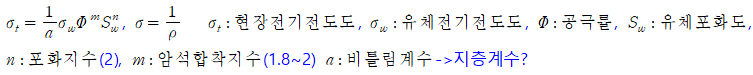 * Archie 법칙 : 다공질 암석내 측정된 전기 전도도를 공극률 및 포화도와 연관시키는 경험식. 시추공의 전기 전도도를 측정. 현대 집수정 log해석의 토대 마련.