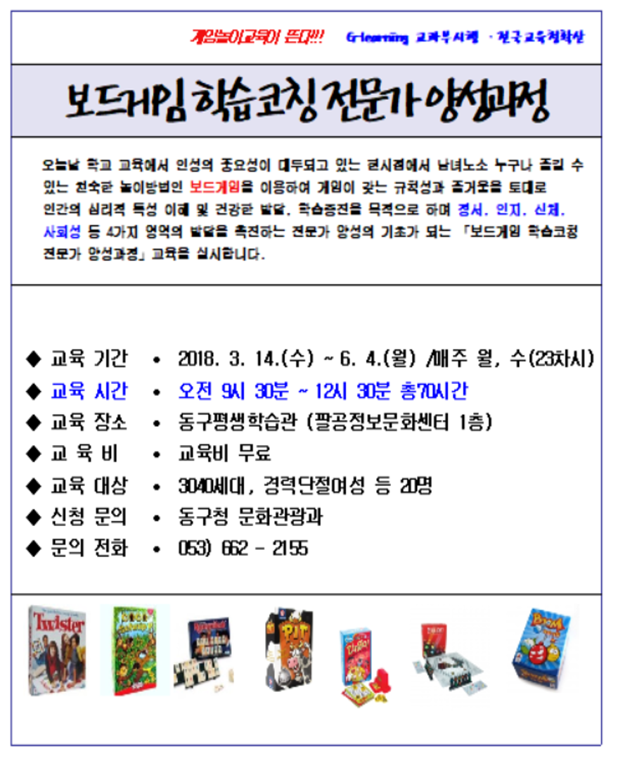 보드게임 학습코칭 전문가 양성과정 작성자박명이|작성시간18.02.23|조회수142 목록 댓글 0 글자크기 작게가 글자크기 크게가 다음검색 현재 게시글 추가 기능 열기 북마크 공유하기 신고 센터로 신고 댓글 댓글 0 댓글쓰기 답글쓰기 댓글 리스트