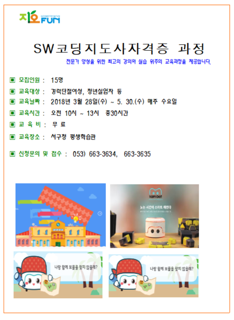 SW코딩지도사자격증 과정 작성자박명이|작성시간18.02.23|조회수160 목록 댓글 0 글자크기 작게가 글자크기 크게가 다음검색 현재 게시글 추가 기능 열기 북마크 공유하기 신고 센터로 신고 댓글 댓글 0 댓글쓰기 답글쓰기 댓글 리스트