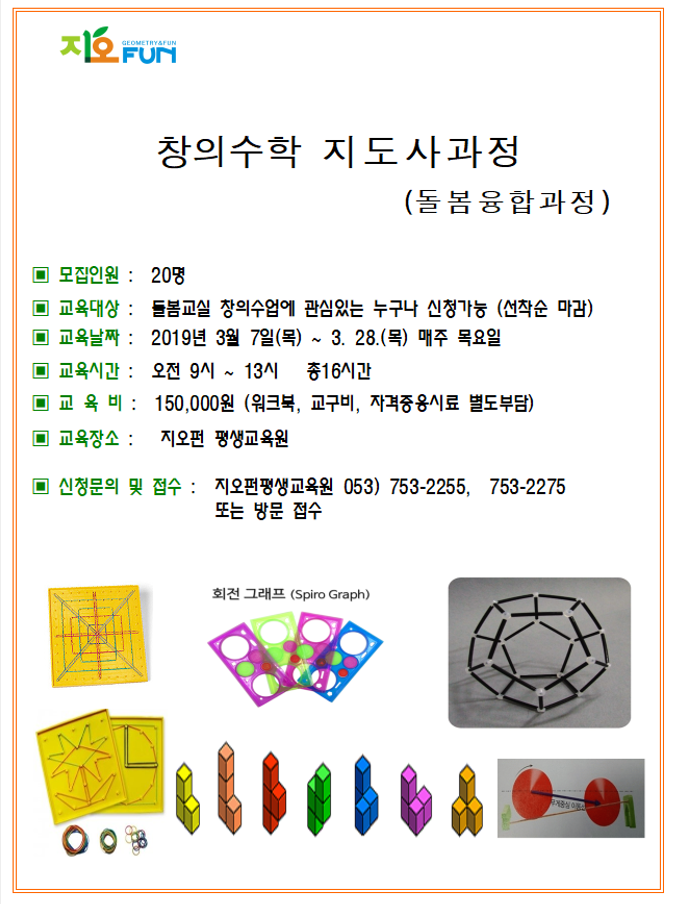 창의수학 지도사과정(돌봄융합과정) 작성자박명이|작성시간19.02.19|조회수129 목록 댓글 0 글자크기 작게가 글자크기 크게가 다음검색 현재 게시글 추가 기능 열기 북마크 공유하기 신고 센터로 신고 댓글 댓글 0 댓글쓰기 답글쓰기 댓글 리스트