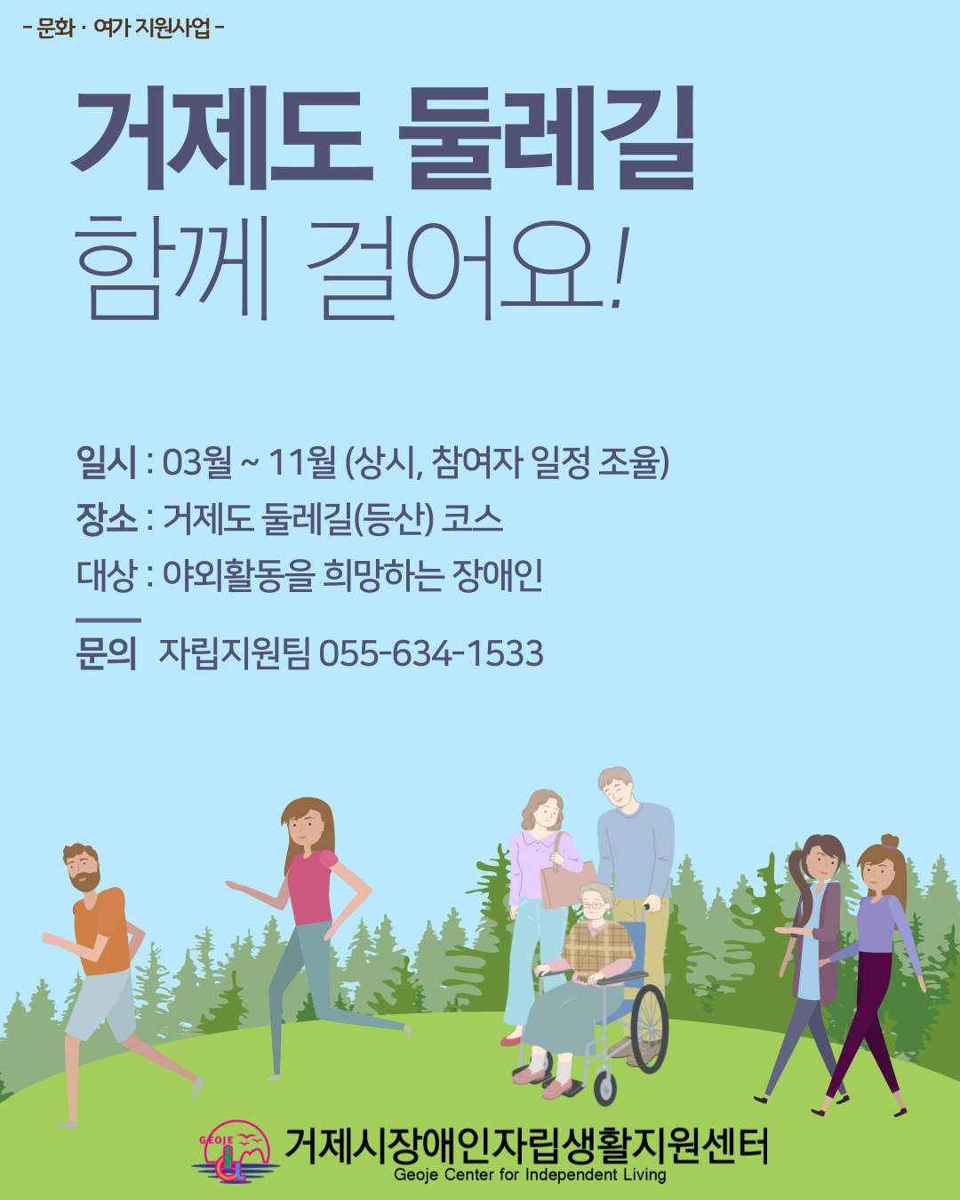 우리 센터에서는 문화ㆍ여가 지원사업으로 거제도 둘레길(등산)을 같이 걸으실 분을 모집합니다.