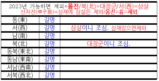 2023년 대장군 북(北). 삼살 서(西). 상문 사(巳). 조객 축(丑).