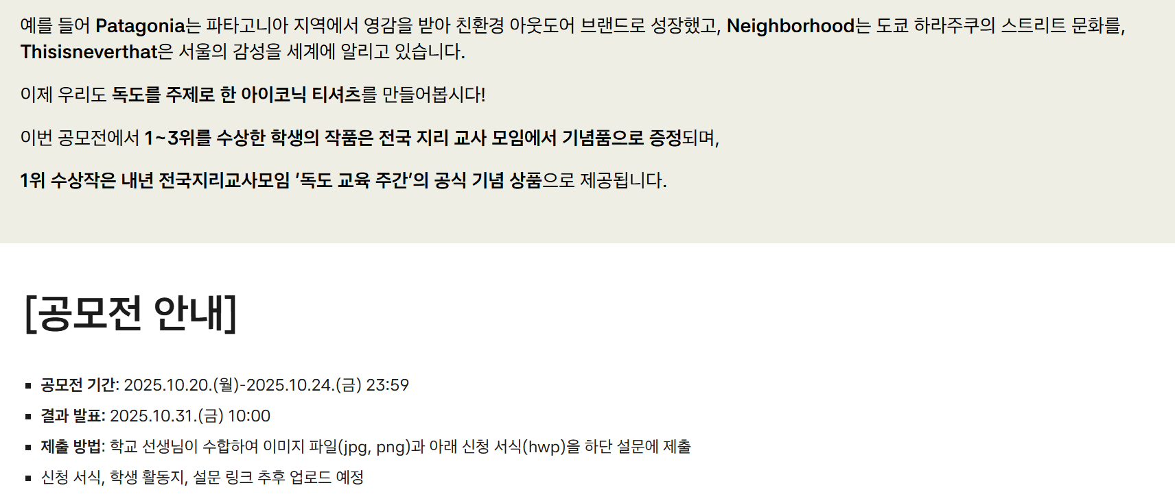 *독도 티셔츠 디자인 공모전에서 1~3위를 수상한 학생의 작품은 전국지리교사모임에서 기념품으로 증정되며, 1위 수상작은 내년 전국지리교사모임 ‘독도 교육 주간’의 공식 기념 상품으로 제공됩니다.