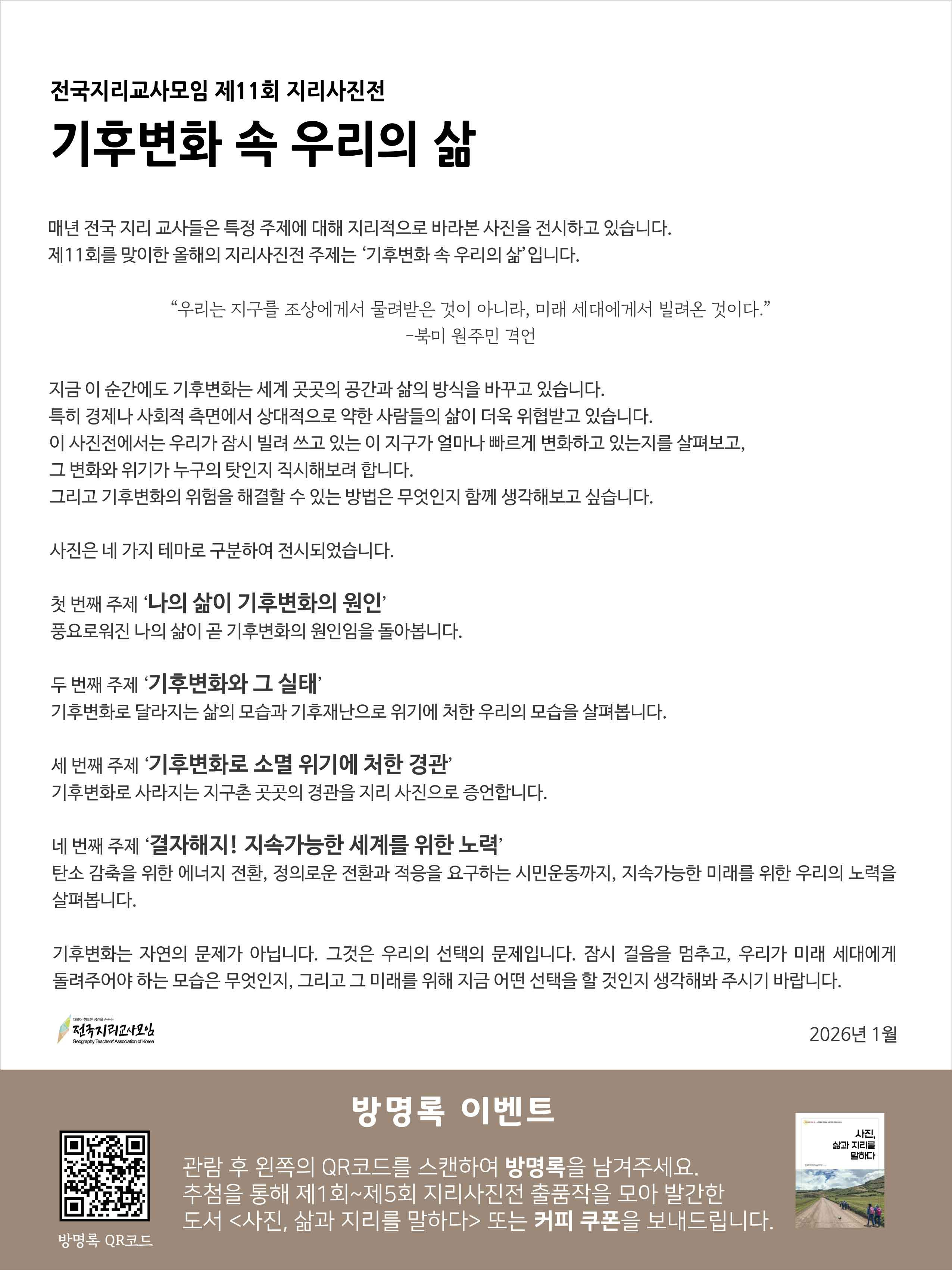 2026년 제11회 지리사진전 <기후변화 속 우리의 삶> 전시 안내 드립니다.