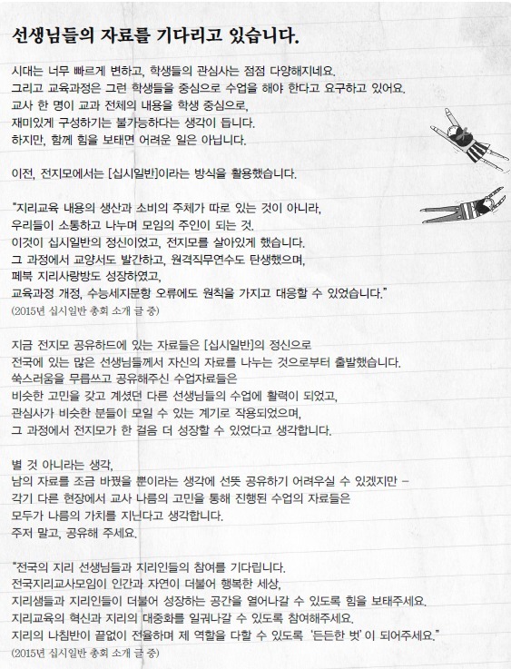 전지모에 회원 가입을 권유해주시고 더 나은 지리교육을 위해 연대해 나갔으면 좋겠습니다. ^^