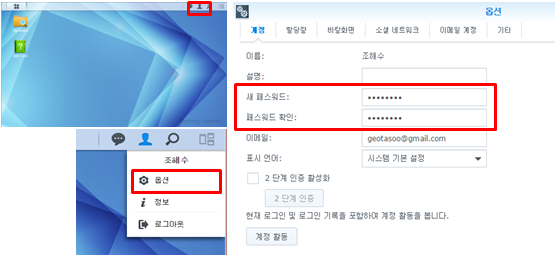 오른쪽 상단 사람모양 아이콘 클릭 > 옵션 > 변경 > 확인