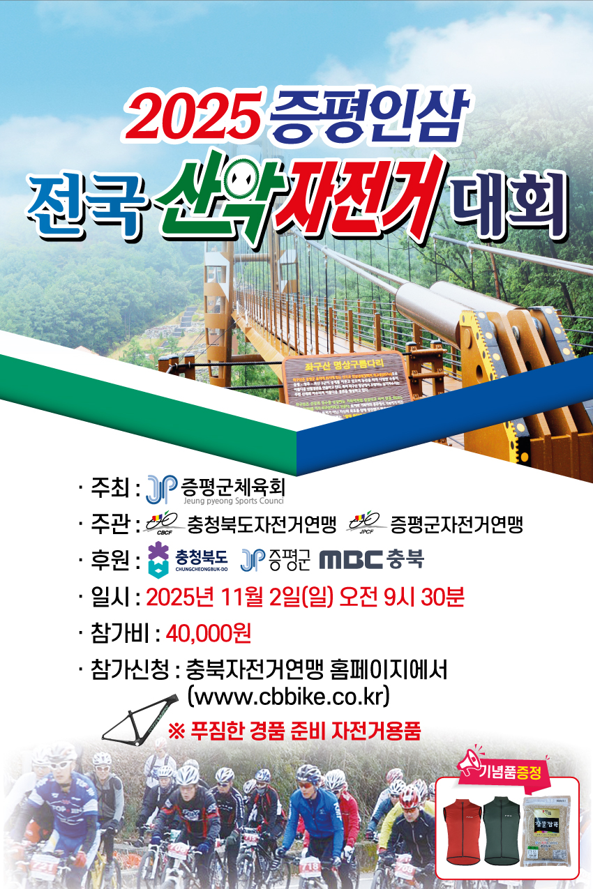 2025 증평 인삼 전국 산악 자전거 대회 안내 11월2일 대회 작성자야미부부(야짱)|작성시간25.07.11|조회수114 목록 댓글 0 글자크기 작게가 글자크기 크게가 2025 증평 인삼 전국 산악 자전거 대회가 증평군 율리 좌구산 임도에서 11월 2일에 진행됩니다MTB마니아, E-Bike,초보 라이더 모두 대회신청 가능합니다층북자전거연맹 홈페이지 다음검색 현재 게시글 추가 기능 열기 북마크 신고 센터로 신고 댓글 댓글 0 댓글쓰기 답글쓰기 댓글 리스트