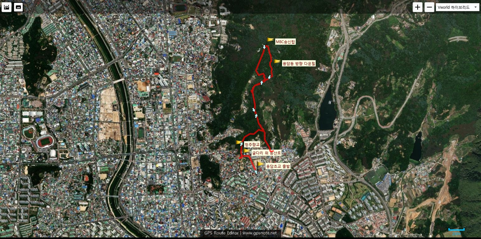 청주향교 우측 뒤 굴다리 위로 (대성동) 등산로 ~ MBC송신탑 ~ 용담동 방향 다운힐 ~ 용담초교(용담동)