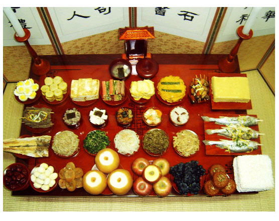 음식의 종류로는 송편, 토란탕, 닭찜, 배숙, 햇밤, 송이 회, 송이버섯 탕, 송이산적, 송이밥, 화양 적, 청포묵 전, 감자전, 모듬나물 부침, 삼색 전, 느타리버섯산적, 녹두부침 등이 있습니다.