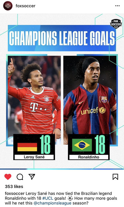 사네가 챔스 통산 18골로 호나우지뉴와 동률