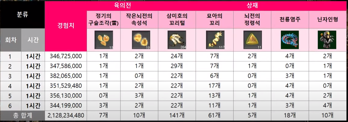 각성도올 삼미호 6시간 사냥후, 시간당 평균.