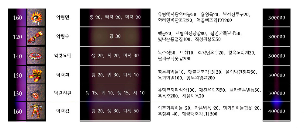 작성자大고구려/추억의꽃 작성시간 08.12.25 악령면과 악령갑은 치우천왕 주술비법,악령수는 무사의 주술비법,악령요대는 일월오악주술비법,악령화는 강력한 주술비법,악령지환은 백색주술비법 입니다