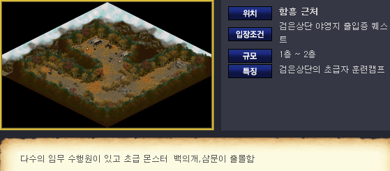 - 위치: 함흥 근처 - 조건: 검은상단 야영지 출입증 퀘스트 - 규모: 1층 - 2층 - 특징: 검은 상단의 초급자 훈련 캠프 |