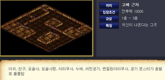 - 위치: 고베 근처 - 조건: 전투력 10000 이상 - 규모: 1층 ~ 3층 - 특징: 귀신이 나온다는 그곳. |