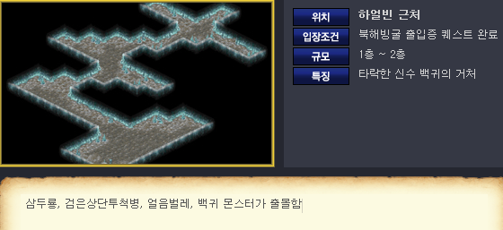 - 위치: 중국 하얼빈 근처 - 조건: 북해빙궁 출입증 퀘스트 완료 - 규모: 1층 ~ 2층 - 특징: 타락한 신수 백귀의 거처 |